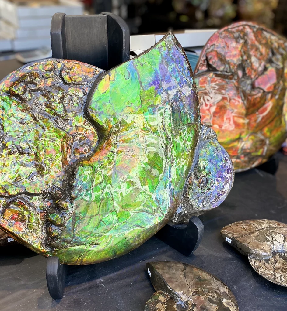 Ammolite is a rare, iridescent gemstone derived from the fossilized shells of Late Cretaceous ammonites, most commonly Placenticeras, found in southern Alberta, Canada. Its shifting colors—caused by the preservation of microscopic aragonite layers—place it among the few biogenic gemstones recognized in the modern trade. These ammonites occur within the Bearpaw Formation, a marine deposit laid down approximately 70–75 million years ago in the Western Interior Seaway. Under exceptional conditions of burial, compression, and mineral stabilization, portions of the original shell retained their nacreous structure, producing the vivid spectral effects seen in gem-grade material. Today, the Bearpaw Formation represents the principal—and effectively exclusive—source of commercial ammolite. Its deposits are tightly regulated, and the recovery of specimens operates within a framework that distinguishes between material suitable for gemstone production and fossils of scientific importance.